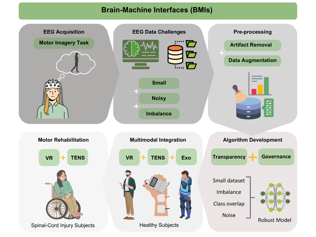 Restoring mobility in individuals with motor impairments is one of the most ambitious goals in neurorehabilitation. At the intersection of neuroscience, machine learning, and assistive robotics, we are developing Brain-Machine Interfaces (BMIs) that can decode motor intentions from brain signals (EEG), even when data is limited, noisy, or imbalanced.